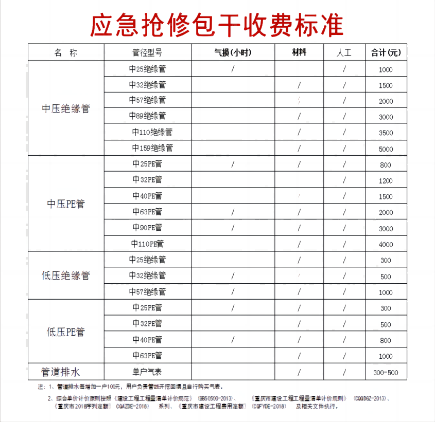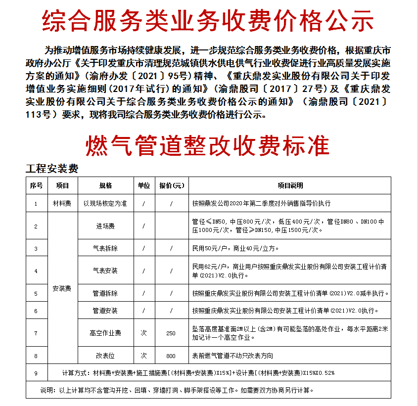 燃氣綜合服務(wù)類業(yè)務(wù)收費價格公示